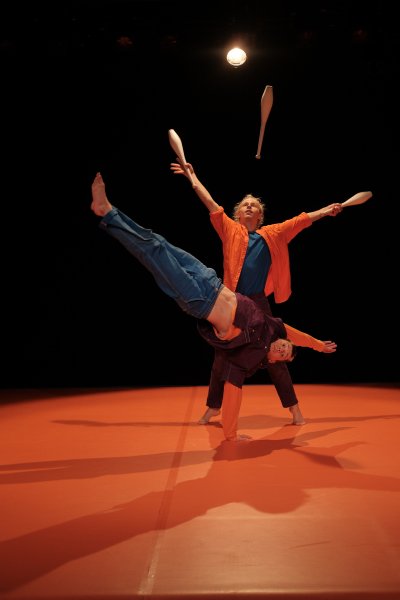« La chorégraphie de Sylvère Lamotte permet à ce duo malicieux d’explorer les possibilités du corps, son agilité, ses acrobaties.
